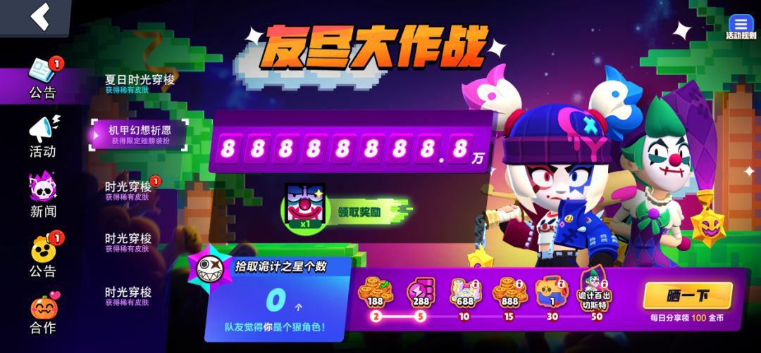 当星妙乐园被像素病毒入侵,熟悉的战场化作红白机!限时电玩商店将开启,收集"经典卡带"解锁专属礼包,所有斗士玩家们都可以在这里兑换快乐!让每一局对战都变成童年游戏厅的欢乐对决!