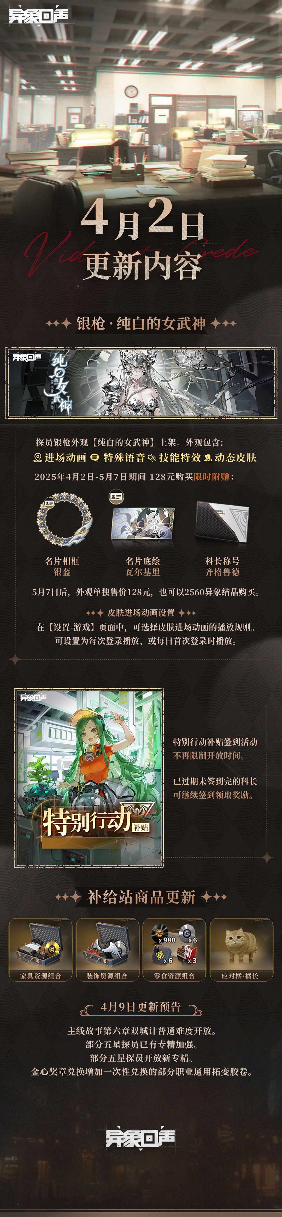 《异象回声》将于4月2日19:00左右进行一次闪断更新维护。