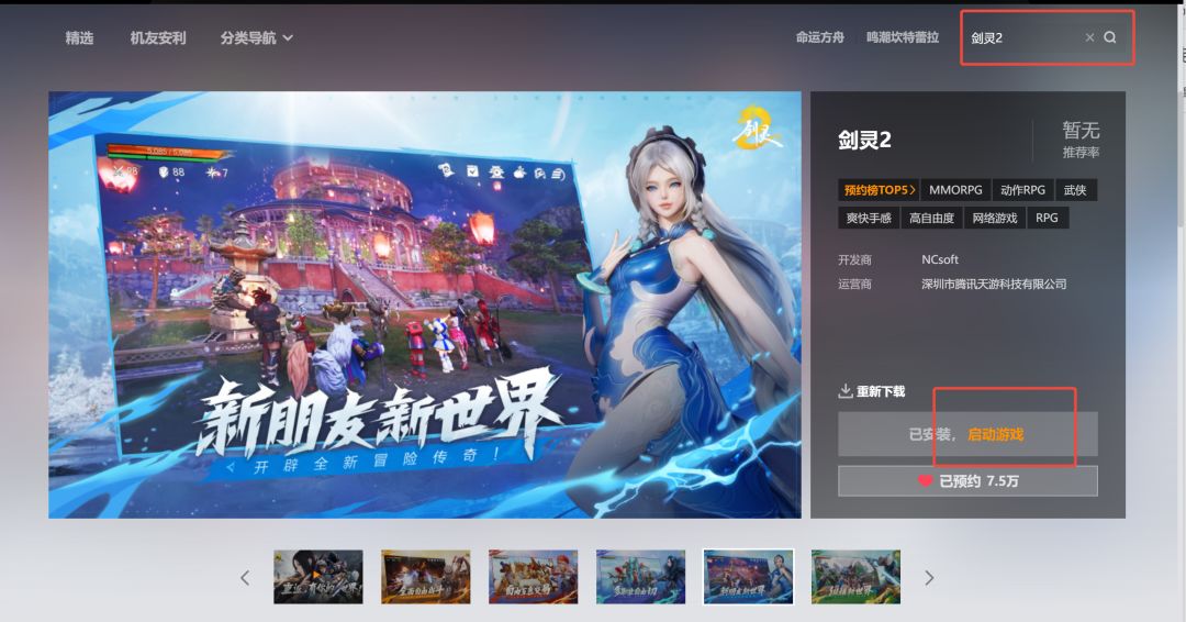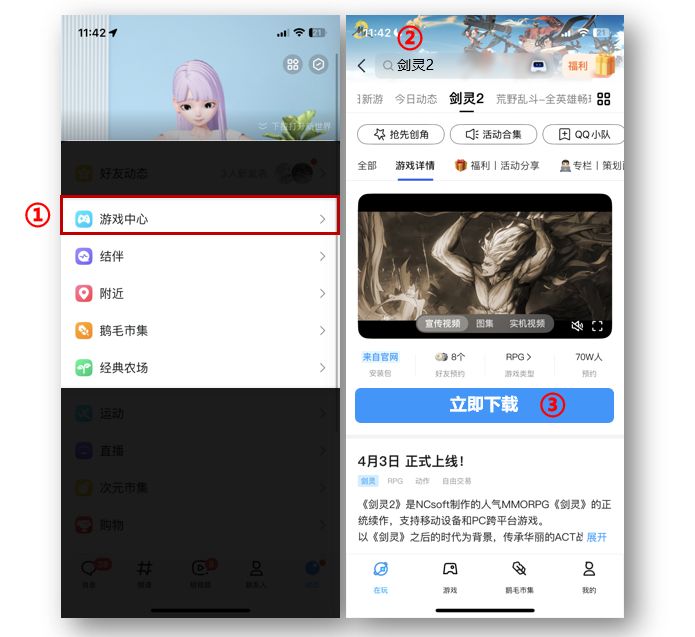 b.搜索栏输入 "剑灵2",进入游戏主页,点击 "立即下载"(需提前绑定手机号完成实名认证)。