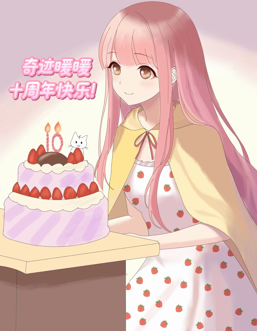 同时说一说我画的思路吧,画同人绘画,还是关于十周年的,不知道为什么,我脑海里面第一反应的就是草莓裙,暖暖设计的第一条裙子,我觉得这条裙子真的很有纪念意义,所以就画了穿着草莓裙庆祝十周年的暖暖,另外黄色的斗篷,单纯就是想把大喵的斗篷也给暖暖画上,哈哈