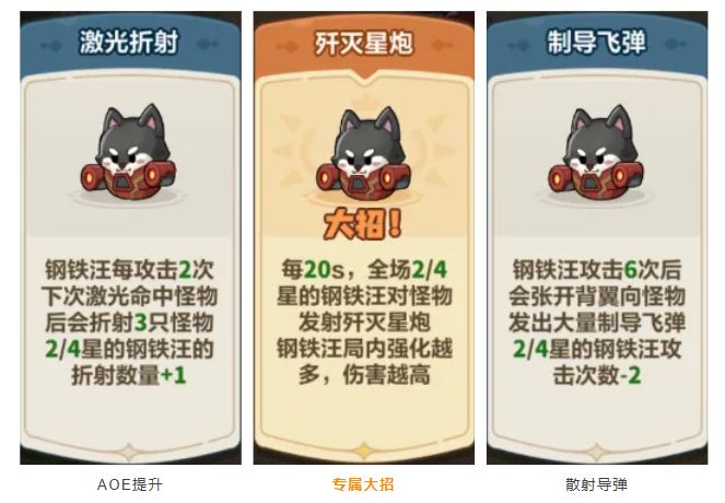 【歼灭星炮(大招)】:每20秒,场上2/4星的钢铁汪对怪物发射歼灭星炮,造成直线伤害。(钢铁汪局内强化越多,伤害越高)