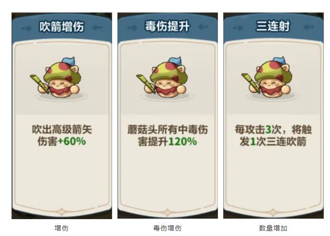 在词条选择上,推荐【增伤】、【攻击次数增加】这类型的词条效果,提高蘑菇吹箭攻击伤害增加击杀敌人效率,从而引爆更多毒蘑菇!