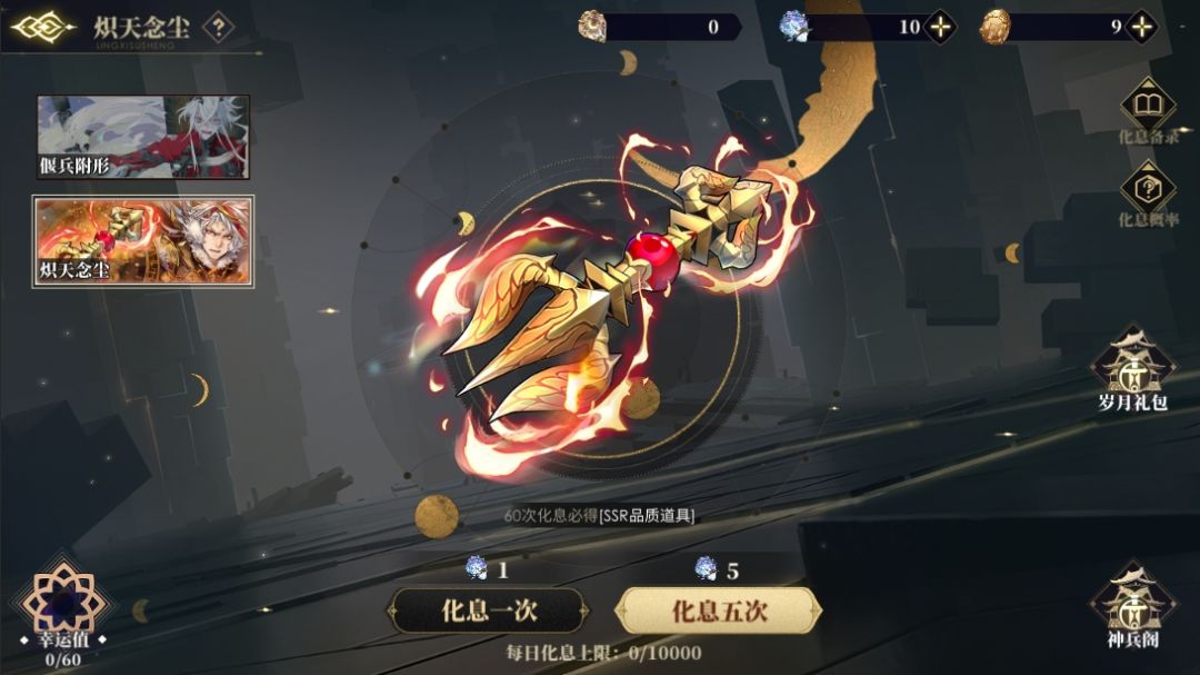 通过「偃兵附形」入口进入「炽天念尘」活动,可概率获得「凤皇专属偃兵-炽天念尘」、「专属偃兵自选箱(6选1)」和「SSR级通用偃兵自选箱(7选1)