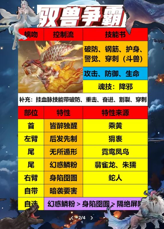 攻略主题:驭兽争霸螭吻篇(一)补充和修正1️⃣螭吻触发被动后的技能有少量近增伤害。纯斗兽方面技能书可以考虑把警觉换成割裂。
