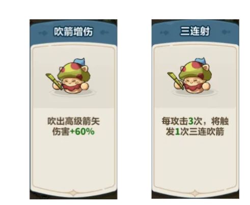 蘑菇头作为击杀Boss的主力输出,推荐走单体爆发流,强化词条选择吹箭增伤和三连射,着重提升蘑菇头的单体吹箭伤害。