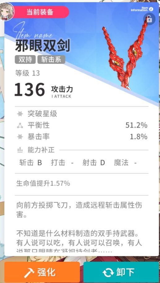 伤害平衡值:与携带武器有关,最高为100%,比如这把邪眼双剑的平衡值是51.2%,那么最终造成的伤害就会在51.2%到100%这个区间内浮动