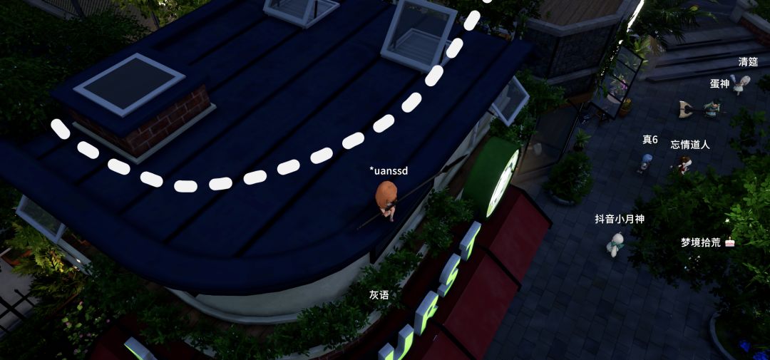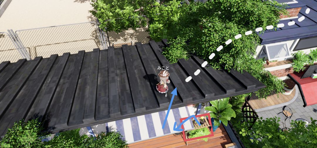 然后跳上架子,踩着花盆跳上旁边的遮阳棚再跳到屋顶上,然后沿着虚线走,到咖啡馆顶上