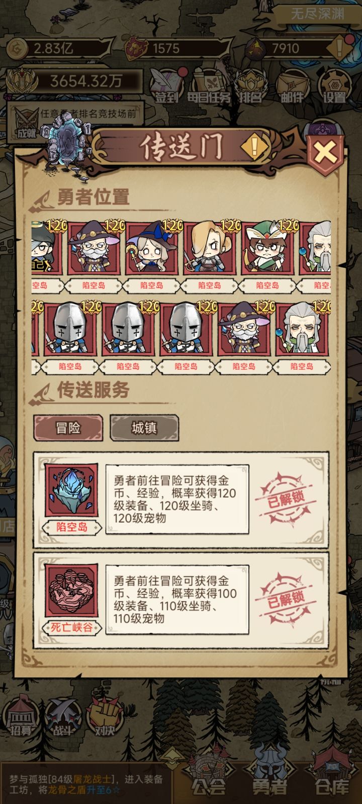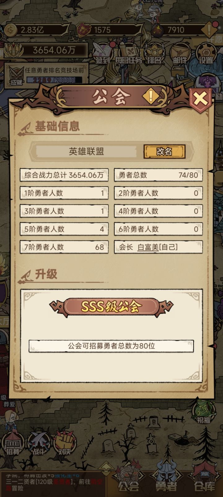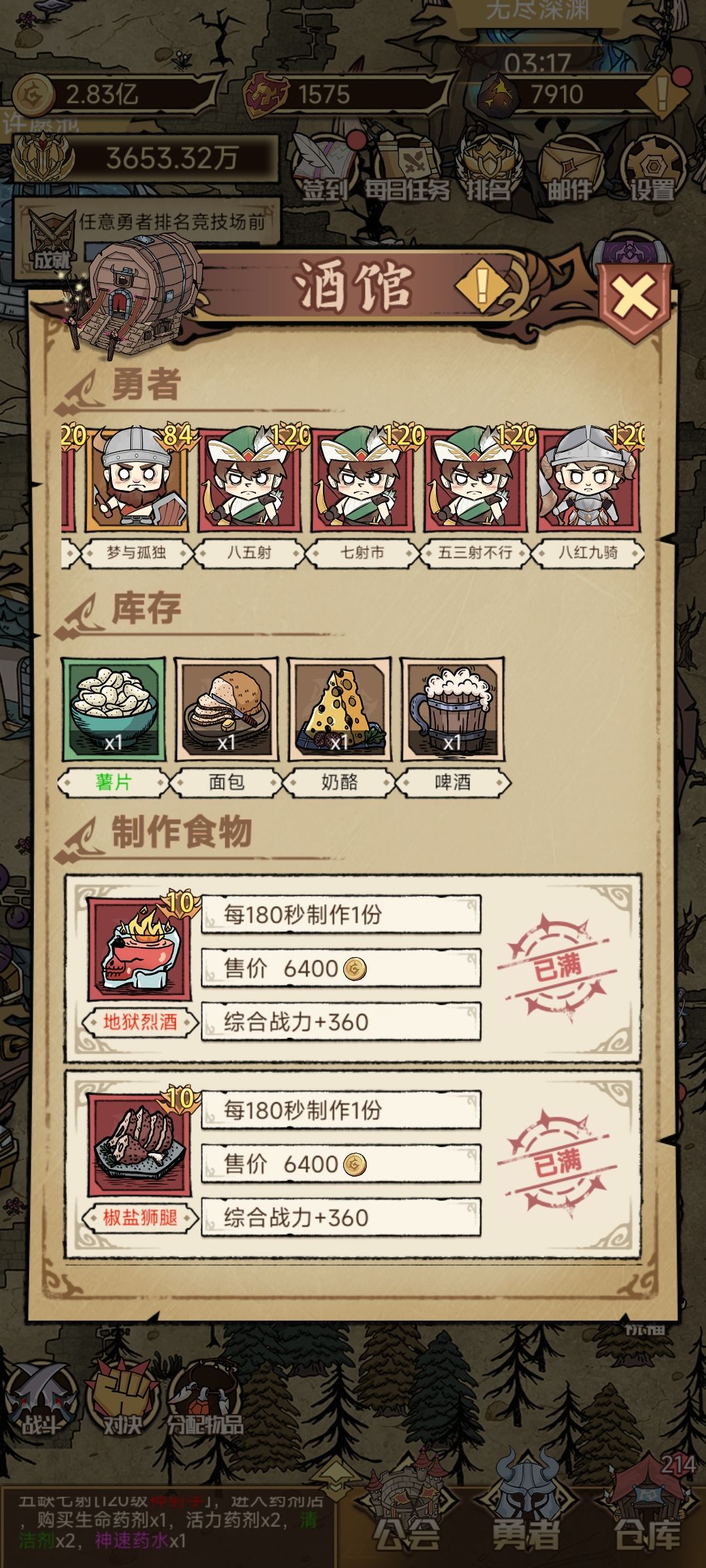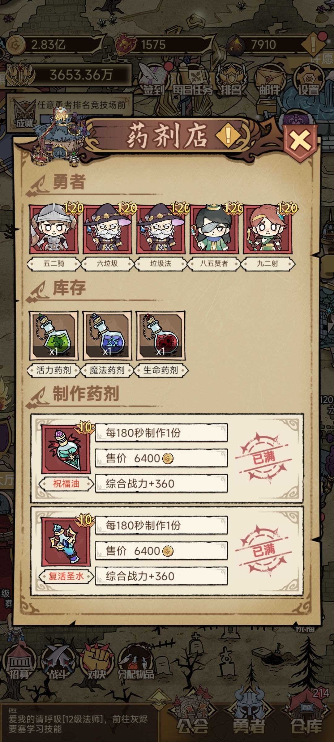 3.招满人了,随便点一下酒馆跟药剂店,升级到最高级,手机挂机挂着就行,一晚上战力蹭蹭蹭的涨,