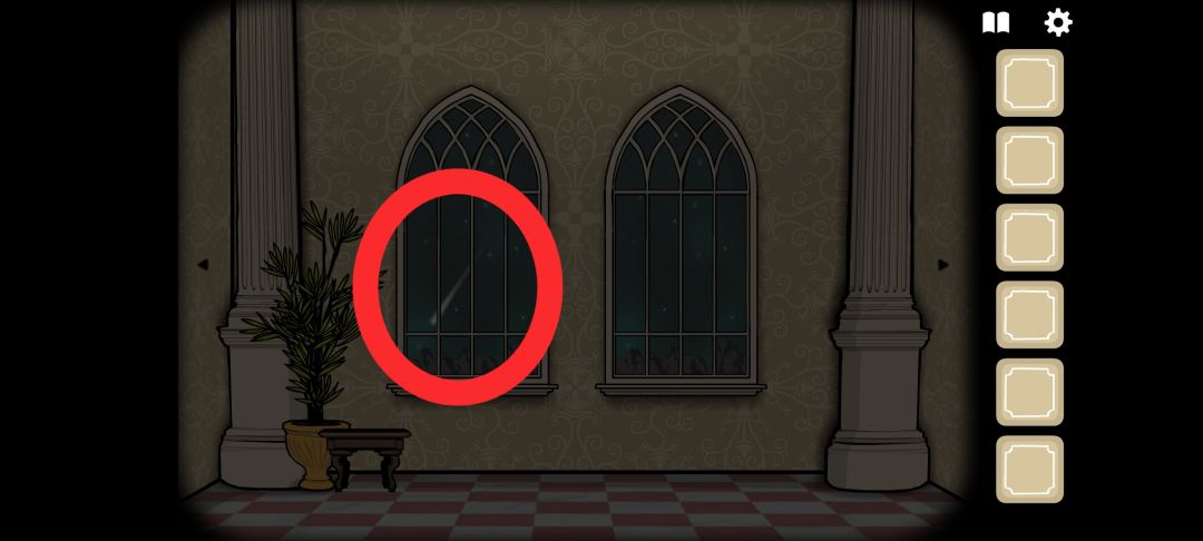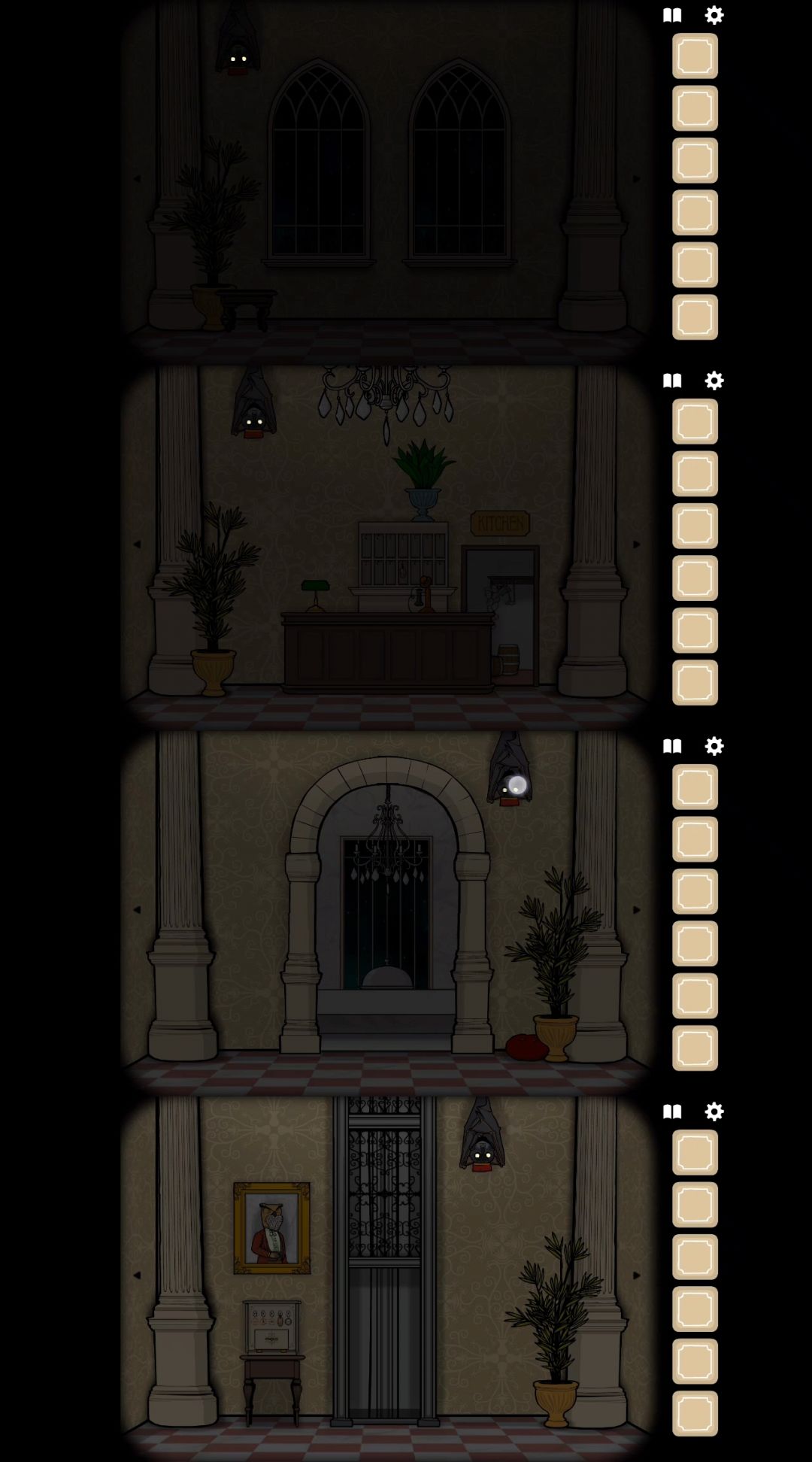 然后开始滑动场景,每个场景都停留2秒左右,当场景中出现倒挂的蝙蝠时,点击它两次,直到它飞走。若不确定,可以在每个场景中点一点,因为每滑动一次场景都会变暗又变亮,而且该过程人物全部消失、且不能触发任何事物。