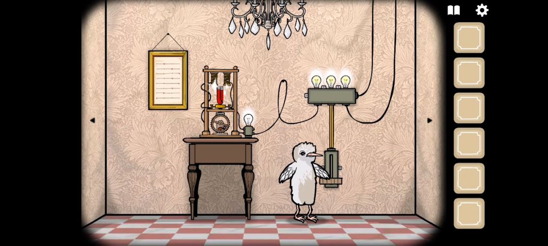 ◇开门后先不要开锁,一直点击右侧的摇杆,让它尖叫6次,从它张开的嘴里得到菜谱所需的[黑莓]。◆然后开锁,放它出来,左滑场景,点击让它启动装置,此时三个灯泡应全部亮起。