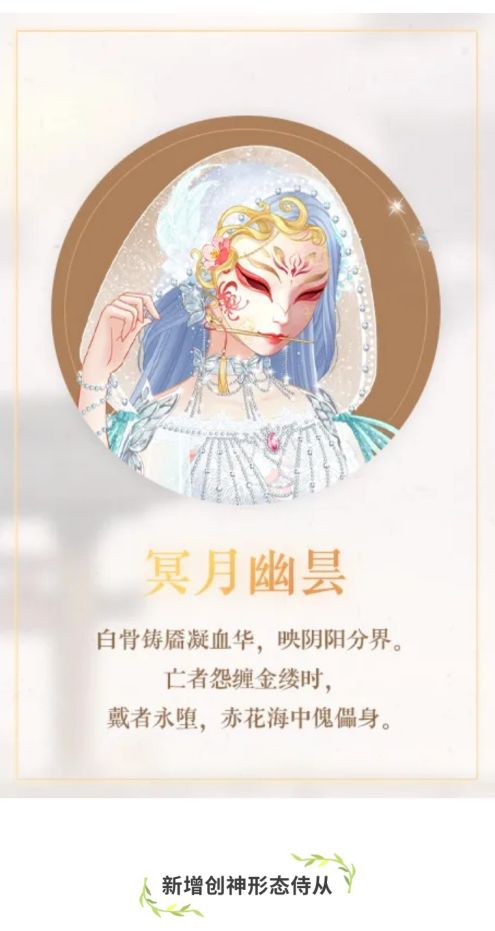 1、新增面具类型饰品:冥月幽昙,拥有侍从幽藏尊且其信物达到5星可解锁制作