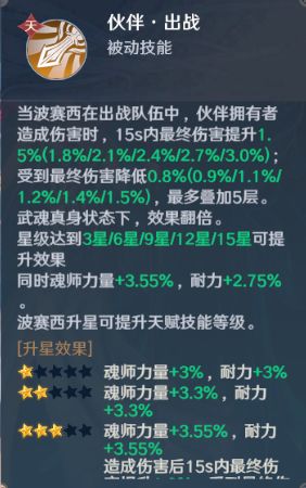 1、上阵该伙伴时,魂师可获得百分比力量以及百分比耐力属性,突破至三星后无需出战也可享受增伤和减伤增益。
