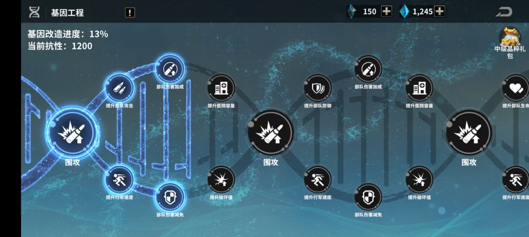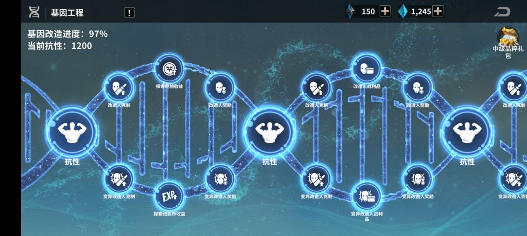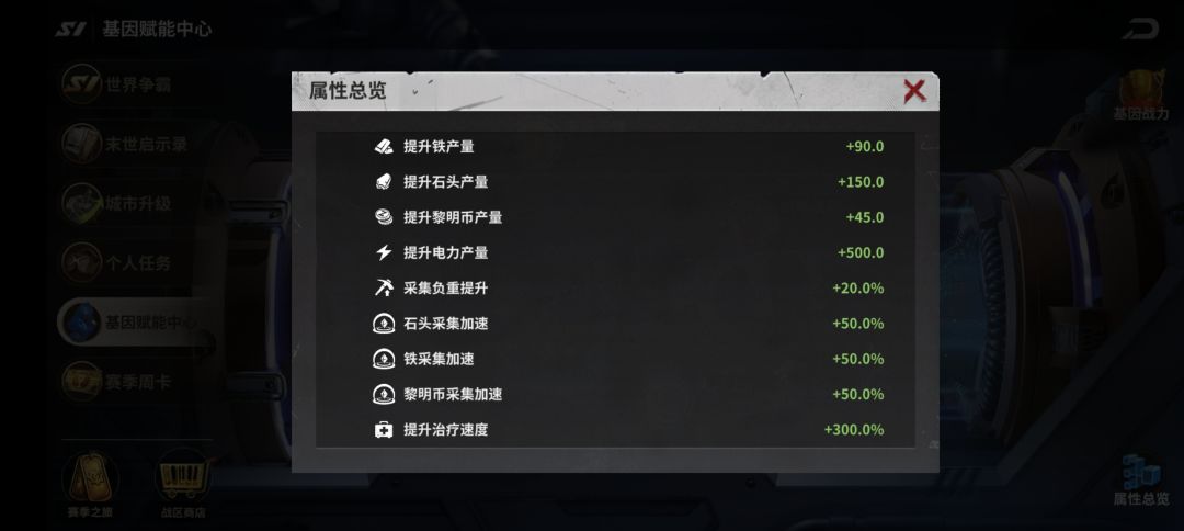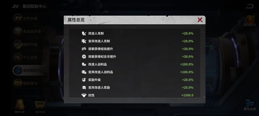 所谓基因工程主要就是通过基因赋能中心来强化基因,提高各种能力的方法。基因工程主要分为末日先锋、大兴土木、战场统御3个部分: