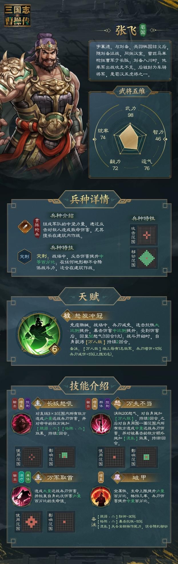 在游戏中,张飞手持丈八蛇矛,冲锋陷阵。他的主动技能“长坂怒吼”,能对直线3×3范围内所有敌人造成少量近战兵刃伤害,并对命中的敌方施加【脆弱】【怯阵】效果。
