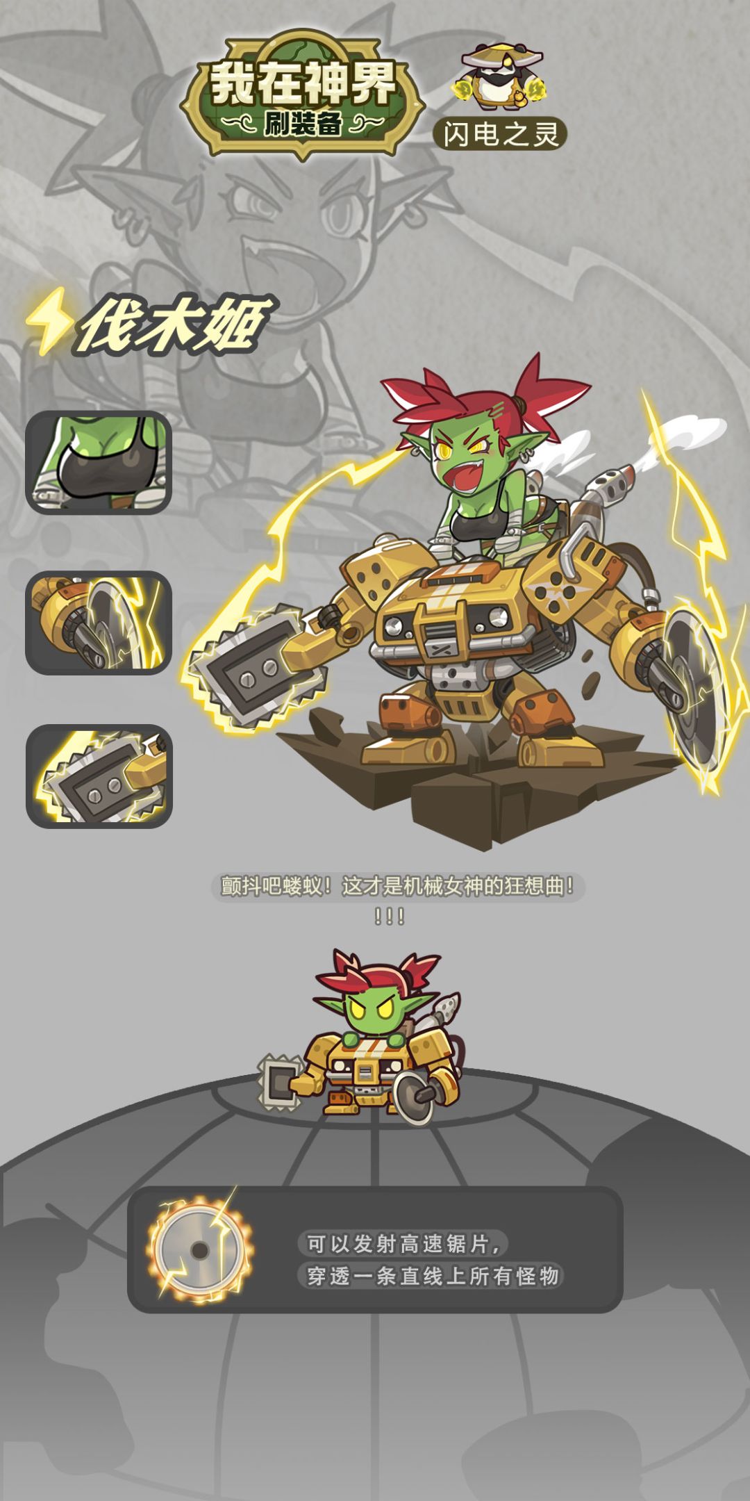 皮肤效果预览:可额外发射一个高速锯片贯穿全场,对触碰到的怪物造成雷系伤害,星级提高后局内可初始获得一张卡牌,并增高速锯片的攻击效果。
