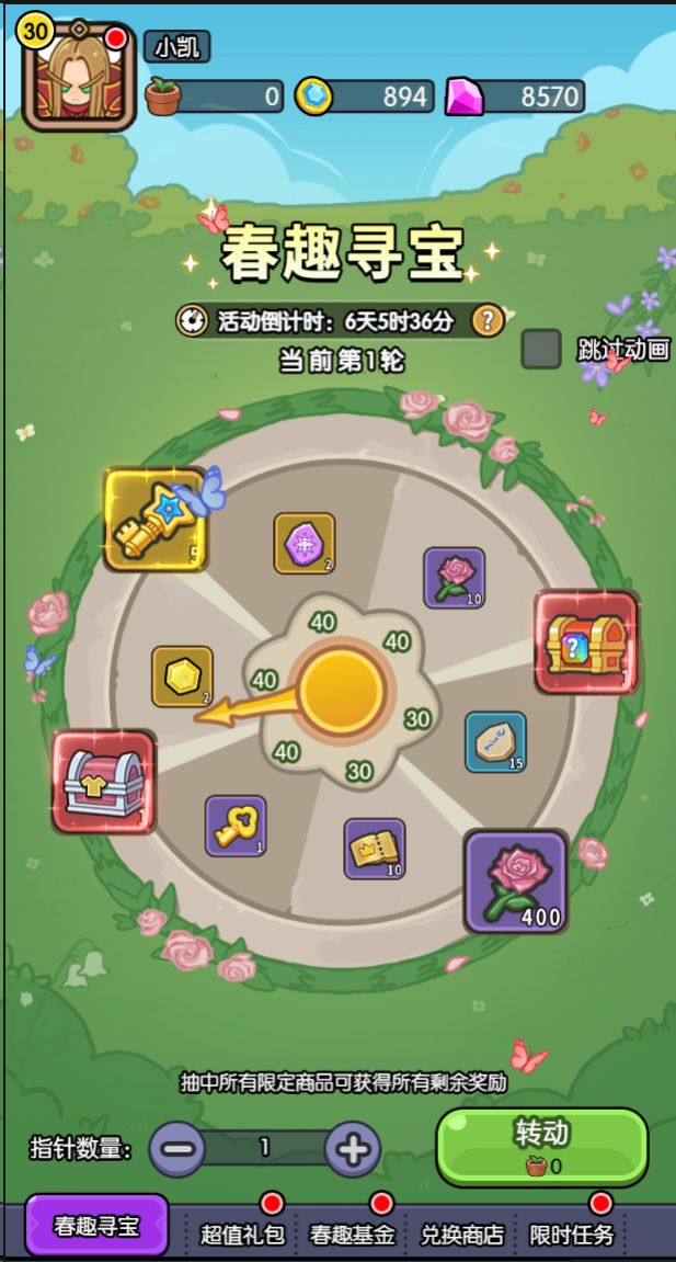 1)寻宝转盘,使用活动道具-盆栽可进行转盘抽奖,转盘有四个高级奖励,每个高级奖励在本轮次内只能被抽取1次,当全部高级奖励抽取完毕,可免费获得所有剩余奖励;