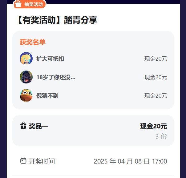 随机抽选3位玩家:20元现金奖*1(随机抽取)