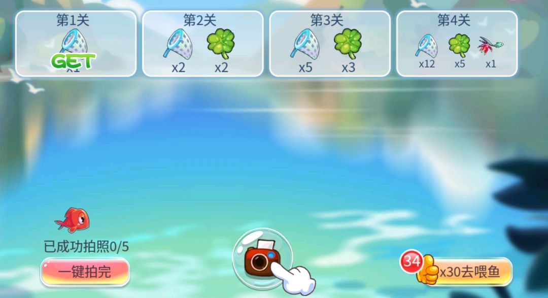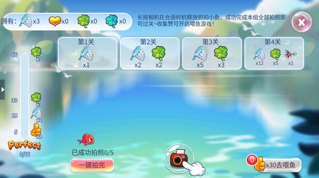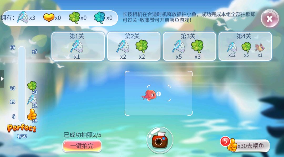 长按相机,在合适的时机释放抓拍小鱼,收集赞和捕蝶网。