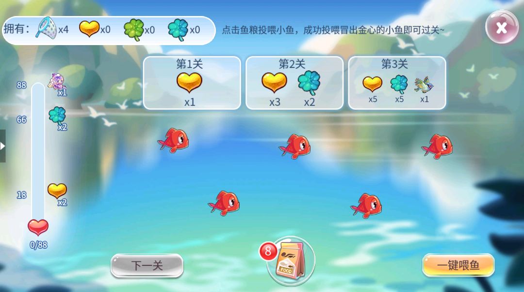 点击鱼食投喂小鱼,过程中收集金心、幸运草~