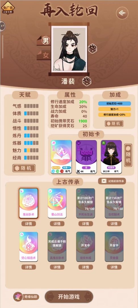 初始卡,需要刷一个遁术25%逃跑率基础天赋,魅力经商高一点即可(加成随便有没有都一样,五矿)中后期基本全靠夺舍同伴的境界,点一下同伴卡可以看到境界全部吞比自己等级高的,最好也留一张差不多等级...