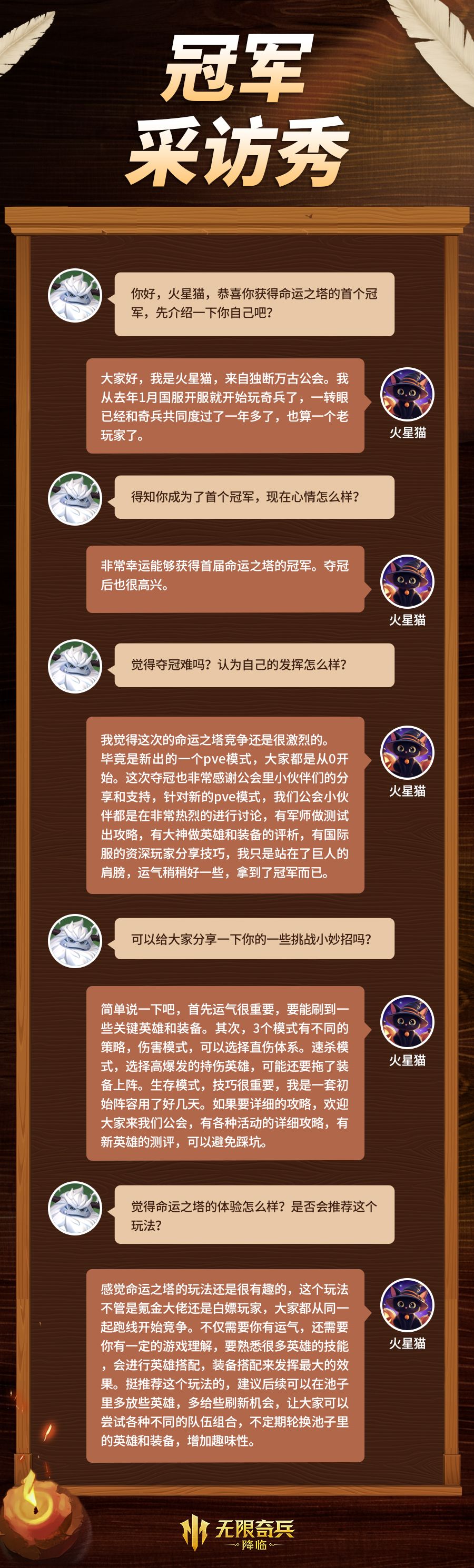 经过几周的激烈角逐,命运之塔的首个冠军也终于新鲜出炉!让我们一起恭喜火星猫!独家冠军采访怎么能少呢?——揭秘他的制胜之道,解锁冠军亲授战术精华,这或许就是你夺冠的法门!