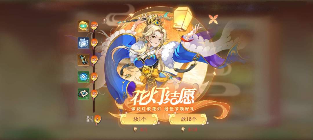 活动内容:活动期间,收集材料制作花灯,每次放花灯都可随机获得道具奖励,累计放飞一定数量花灯可获得额外的奖励。