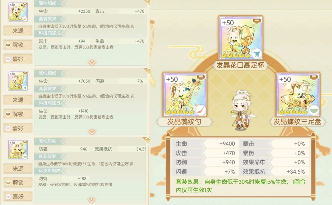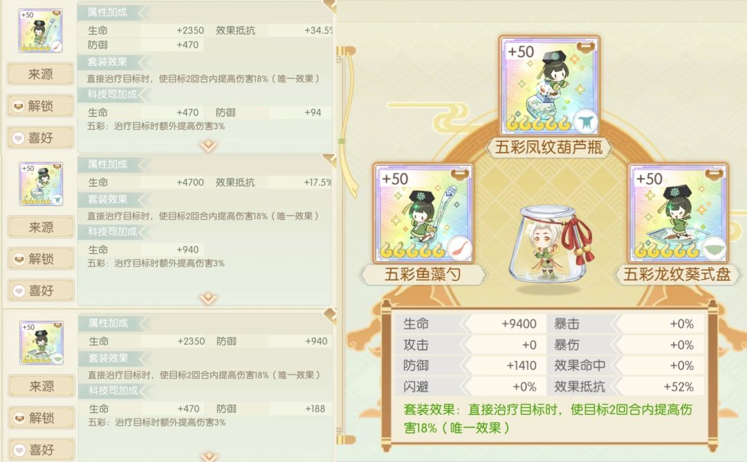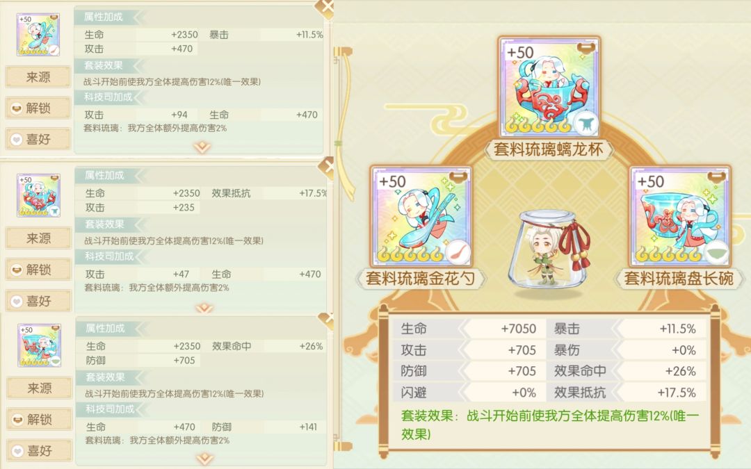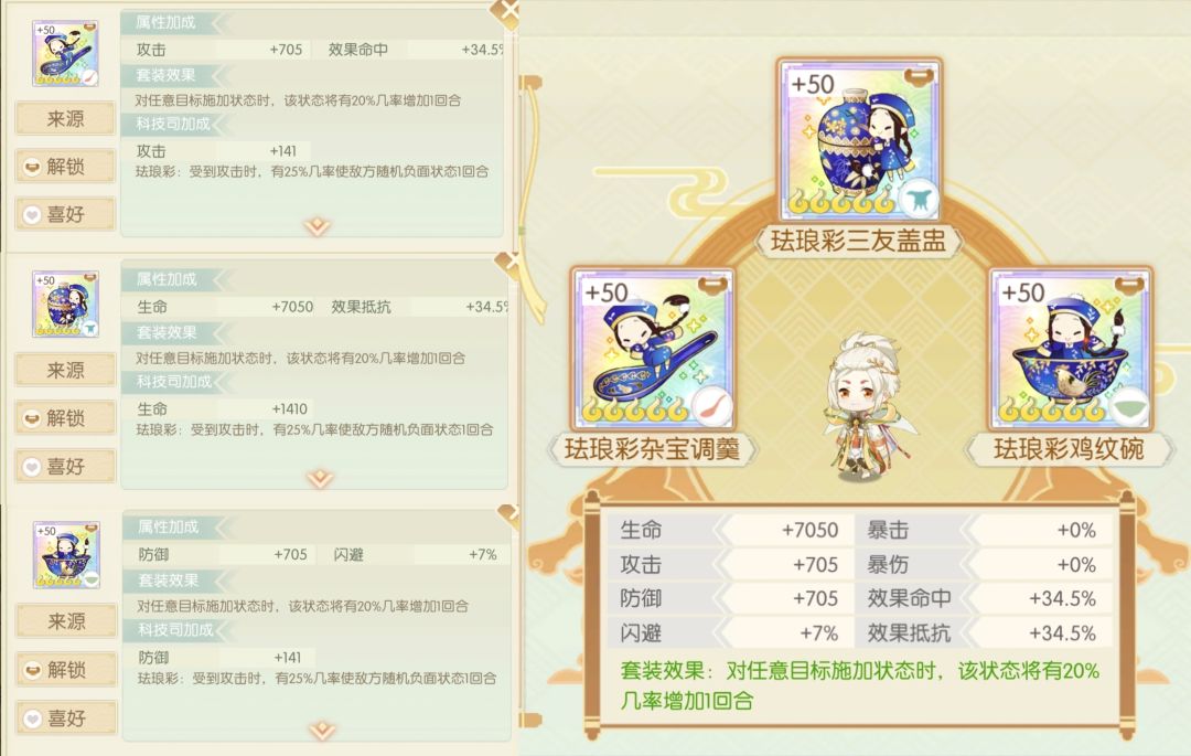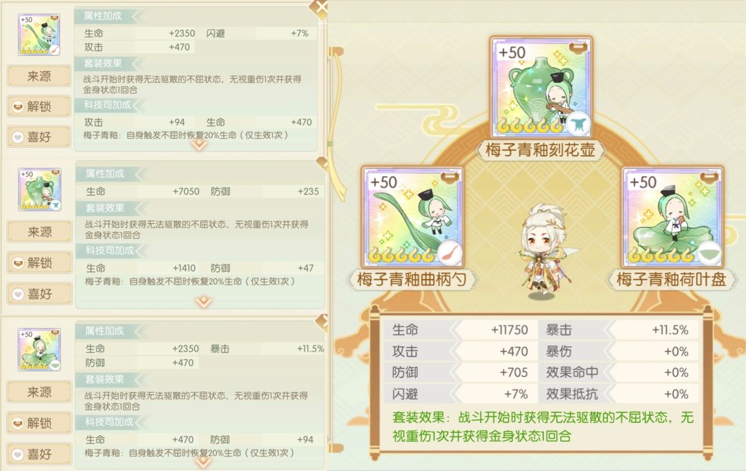 简评:也是数值都给到了抵抗,成套还可以给队友加20%抵抗,较于散件更有些实用性,下位白釉数值也是较低不推荐