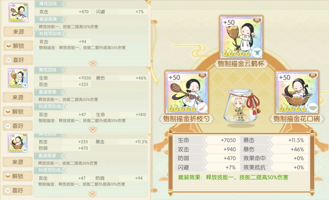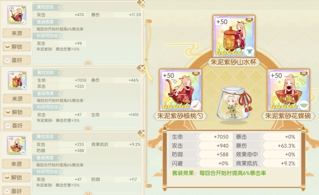 简评:昔日冲榜大哥,如今暂无稳定就业,暴击虽然有但是不高,更稳定的推荐百宝嵌吧,下位彩陶还是可以养的,珍膳之中还算不错,简单好成套