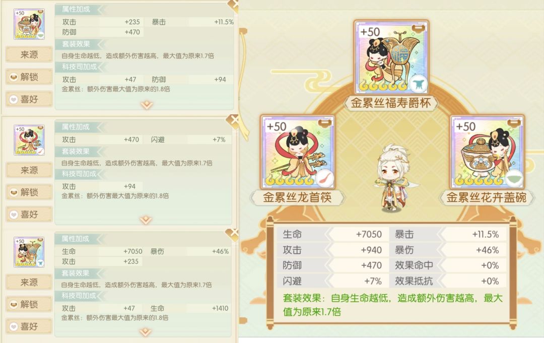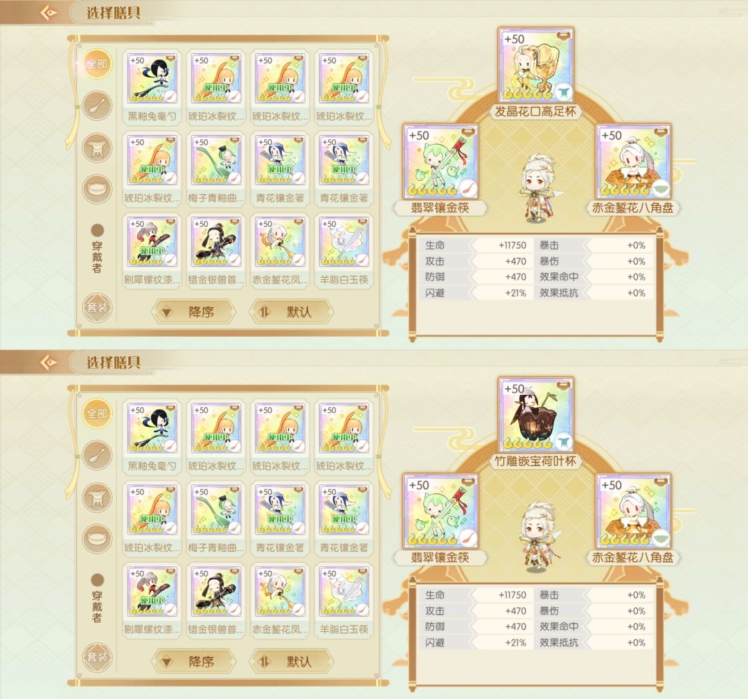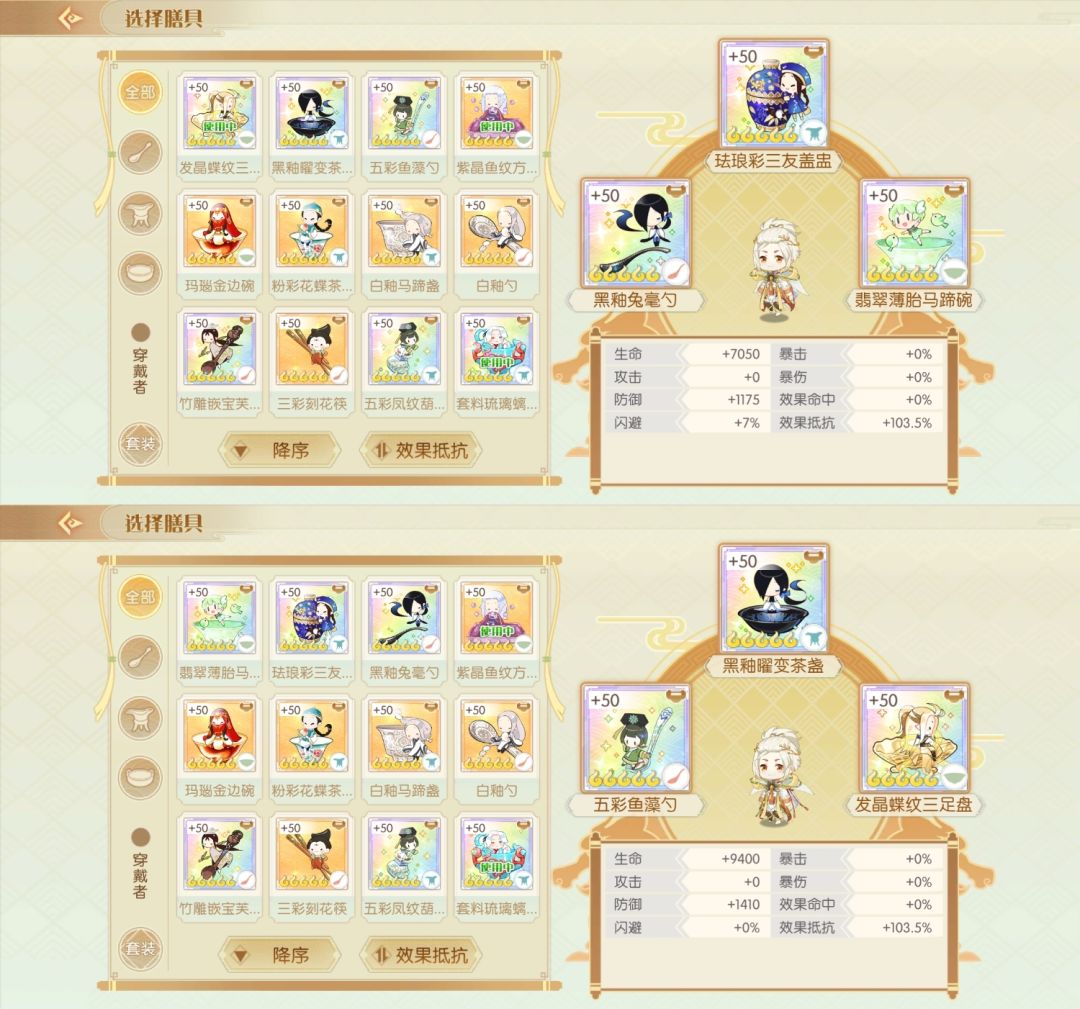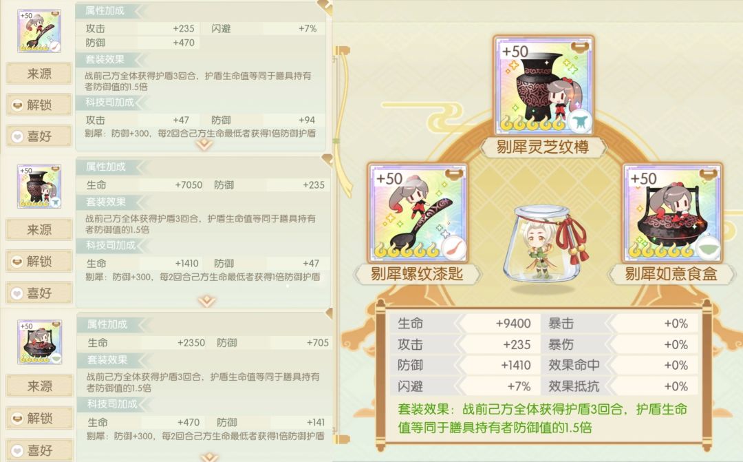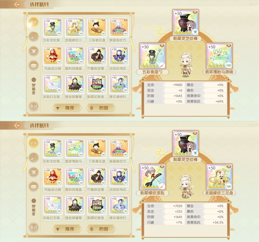 简评:防御的膳具还是比较多的,看需要生命还是攻击+闪避吧,主要需要防御套的也就是御笔猴头和百仁全鸭,百仁攻守都能用,猴头倒是比较少用到,可能是开发或了解不多吧