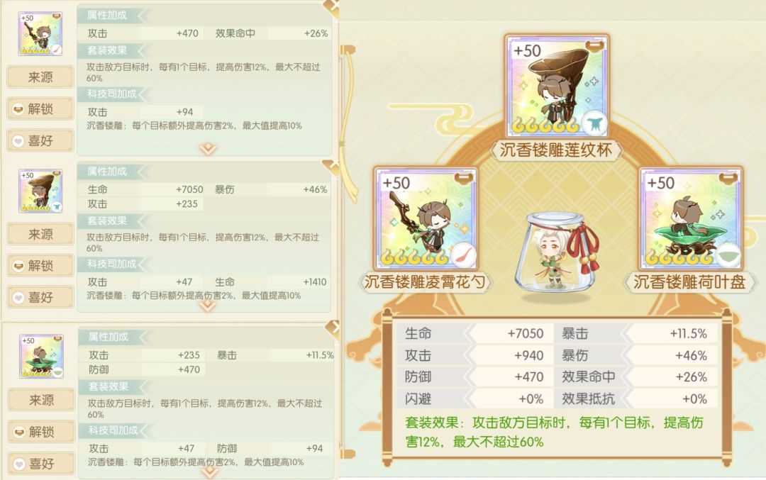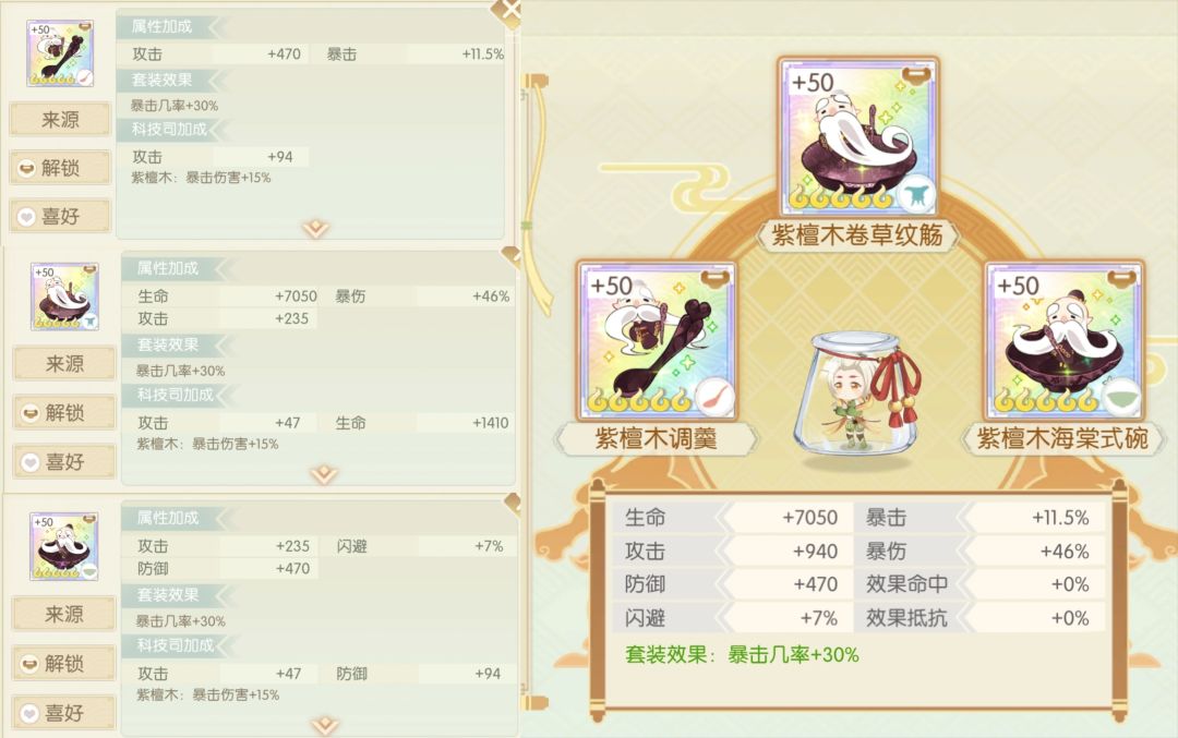 简评:有暴击,高爆伤,有命中,非常全面但是都不算顶尖,5个目标就能达到满加成,守护遗珠目标溢出,厨艺大赛通常情况目标不足,但好在比较全面,灵活使用也不愁就业,凑齐之前可以先养下位黄杨木,但不是首选推荐