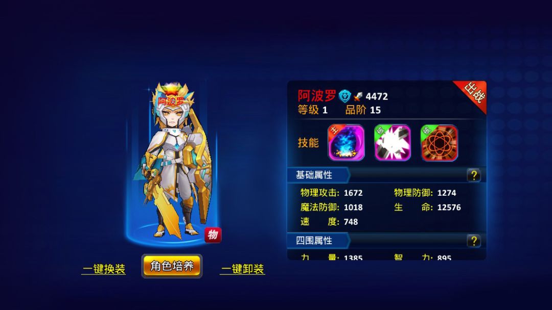 ③被动技能:战斗开始时,阿波罗庇护我方攻击力最高的队友,为其抵挡60%的伤害,庇护效果持续存在并且阿波罗承受的分摊伤害减免50%。并提高目标的防御力50%,持续7次。该效果不可被净化。(以上为满品阶状态下数据)