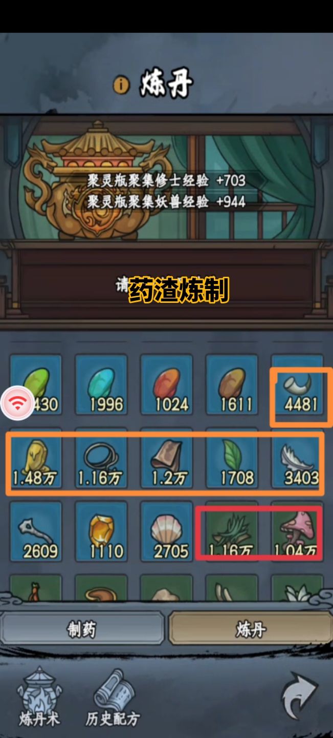 图三,药渣炼制,橙色框随便选一种拉满9,在加红色框中的一种数量1,直接炼制基本都是28药渣