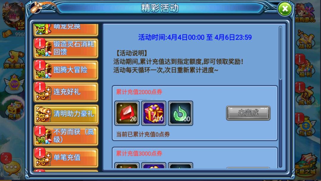 活动期间内累计充值3000点券:高级强化石*30,图鉴升级礼包*400,古玉*800