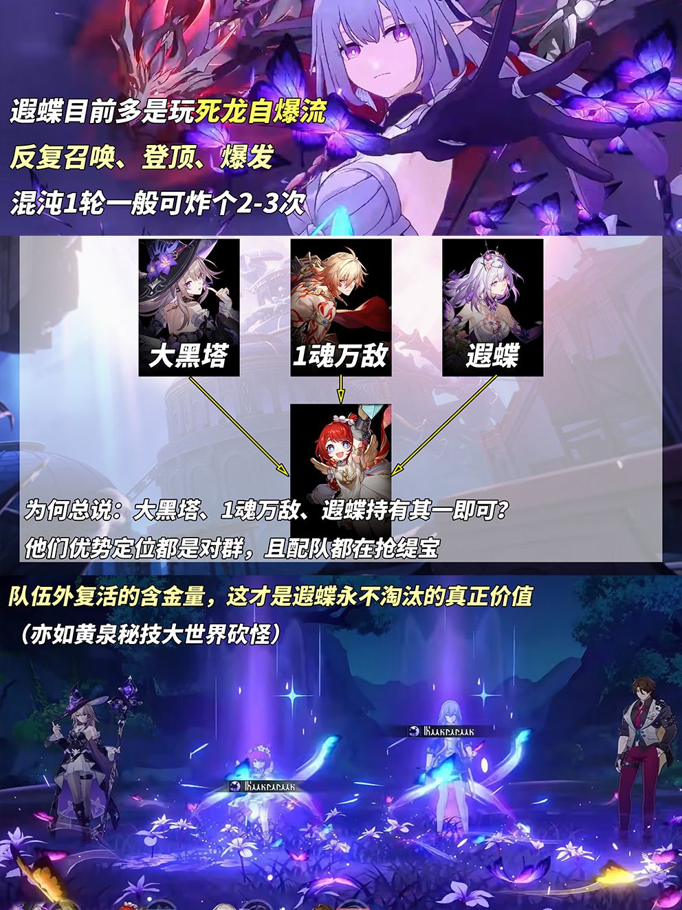 【遐蝶】推荐配队‘遐蝶+记忆主/星期日+缇宝/阮梅/佩拉+加拉赫’,基本不存在抽到手玩不了的情况,其中记忆主需星期日1魂才有正向提升,缇宝追加攻击搭配加拉赫挂酩酊可快速帮遐蝶充能。