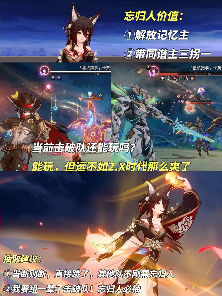 此时复刻补忘归人有2种意义,记忆主愈发重要不得已要拆击破队,或玩‘同谐主+阮梅+忘归人’三拐一以更强数值来应对膨胀。