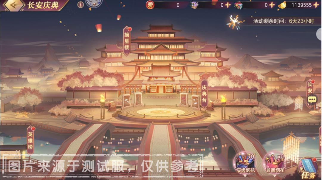 活动期间,累计庆典「繁荣度」达到指定要求,即可解锁【摘星楼】奖励,含随机福袋「烟花礼盒」、兑换道具「庆典花篮」和稀有兑换道具「高级花篮」等。