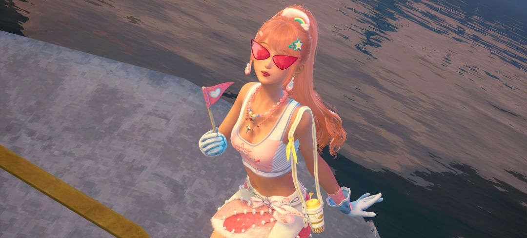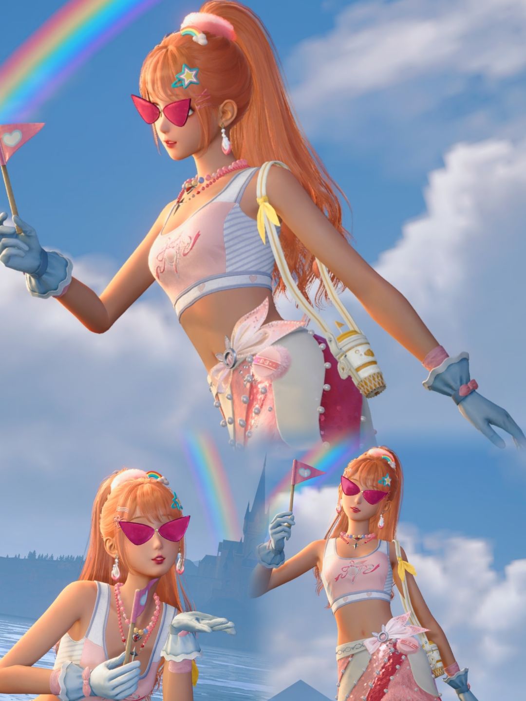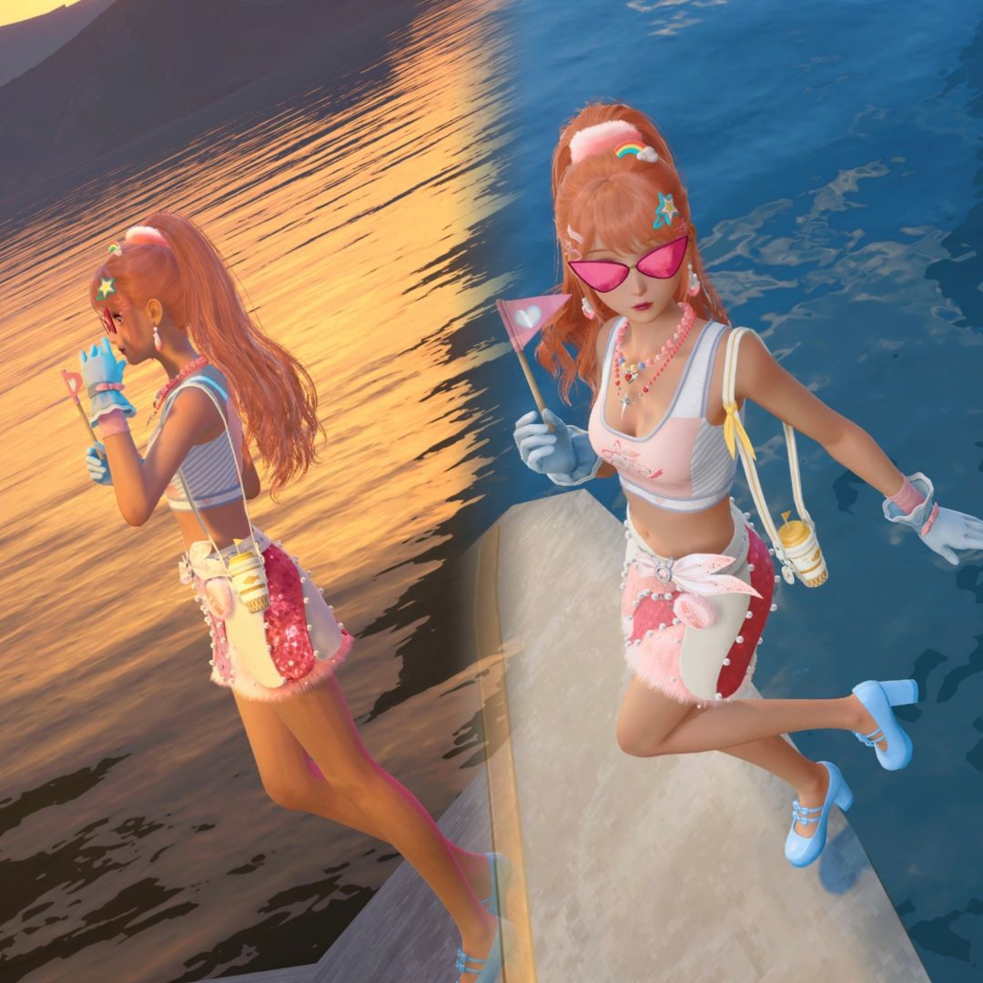 发饰:极繁主义/耳饰:耀目信条/颈饰:斑斓垂链/手套:凉爽触感/面饰:气场全开/挂饰:水分补给/手持物:指挥好心情
