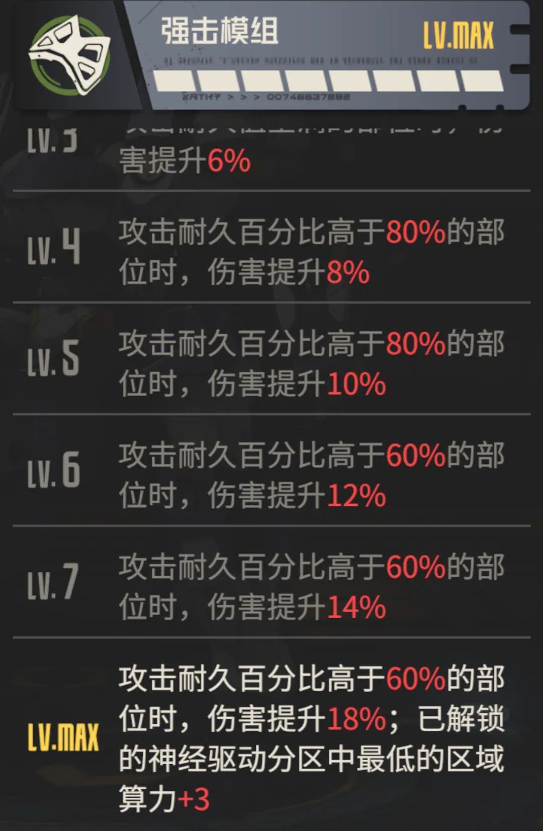接着则是第二个模组,这个模组部除了18%的条件增伤外,最关键就是能让我们神经驱动分区中最低的区域算力+3,说白了就是把γ区7+16的算力给变为10+16,而大家在刚刚的γ1区截图中也能看到,相当于就是把“斩杀”的血线进一步提升到了25%,有点强力了......