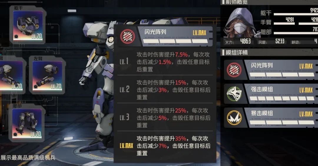 接着是其专属机兵疾啸的模组信息,基础模组几乎就是35%的常驻增伤......当然在打boss类型的副本中,需要一些小兵来进行辅助。