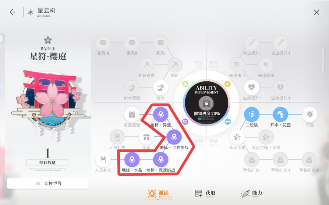 在樱庭世界中的「XX地图」有4种是通过星云树消耗激活点进行开启的,分别是异变、世界挑战、竞速挑战、水晶