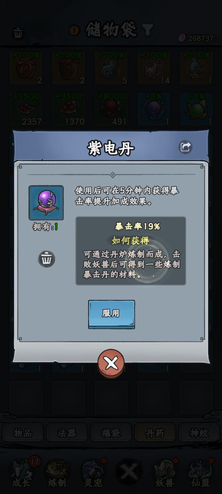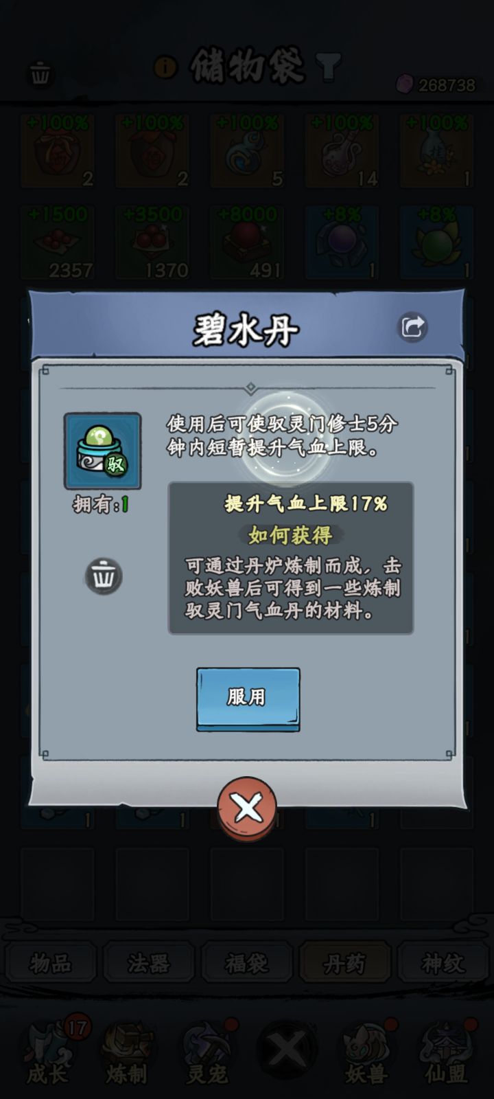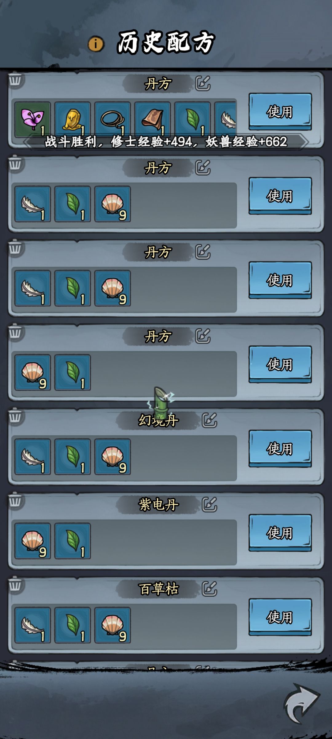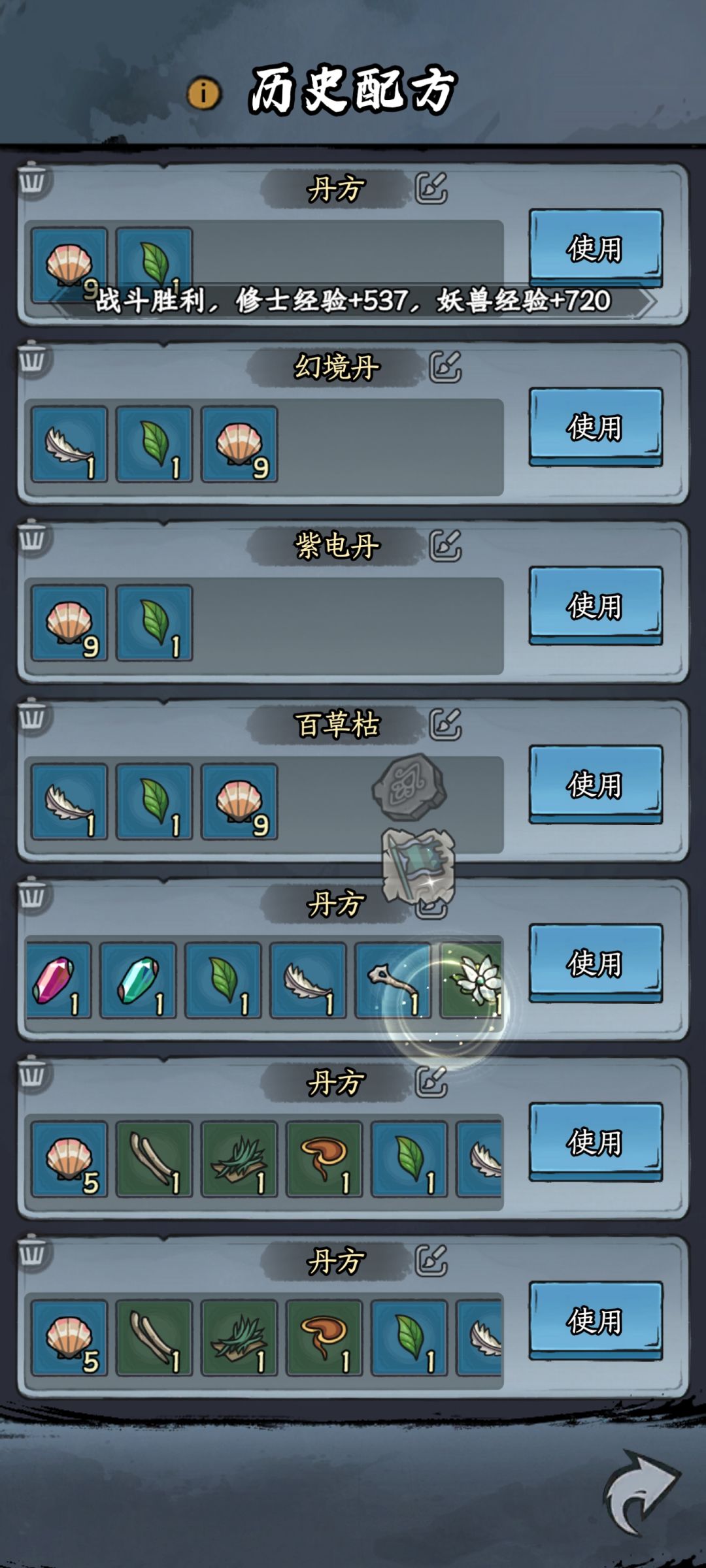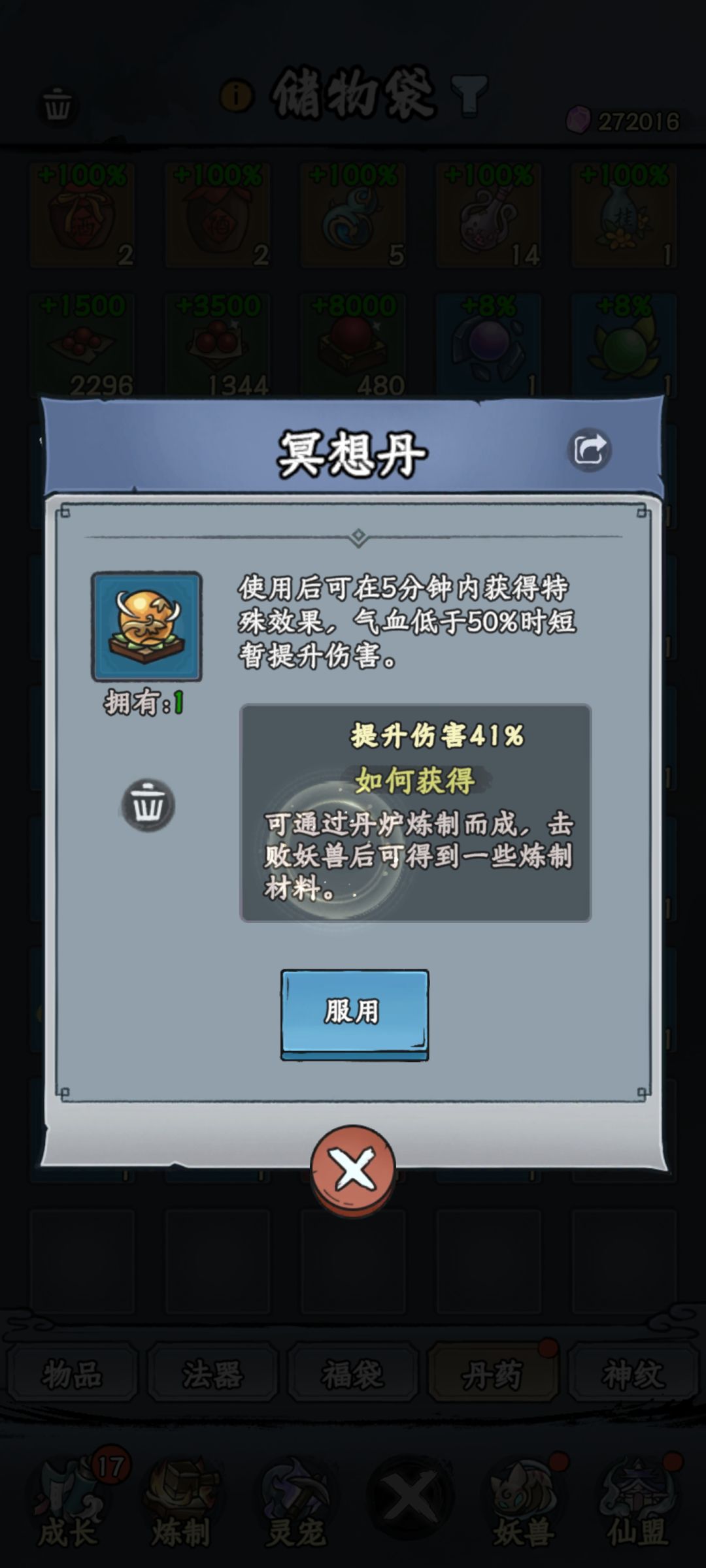 本来想炼制增伤丹药,神仙水,百草枯,耗子尾汁,连花清瘟炼制出来效果没有冥想丹好,41的增伤,很乐观的伤害,遇到天象增益,可以直接挑战BOSS。依靠这个方法过了很多BOSS关卡。炼丹每次都是随机,要每天都去炼制一点存着,希望加大存储空间。
