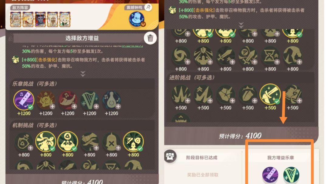 4000分阵容首先是4000通关攻略,敌方乐章选择紫笛,机制挑战的2,3和第一排最后一个,和任务要求的进阶挑战的第五个,我方增益选择紫笛和绿琴