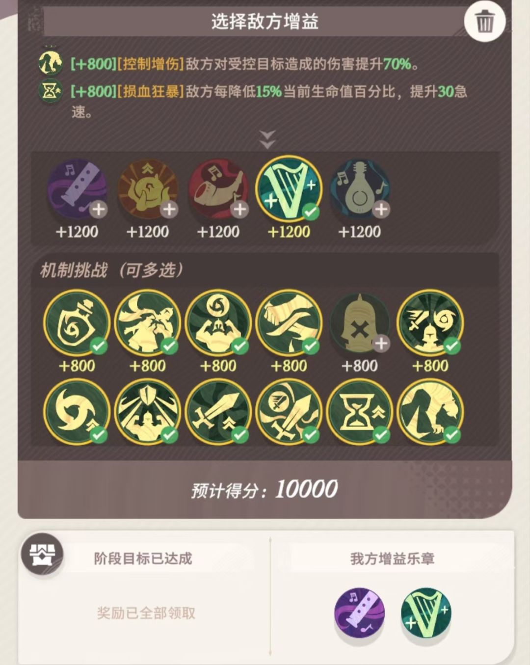 然后是一万分的任务,敌方乐章选择绿琴,机制挑战除了第一排倒数第二个不点,其他的都点,剩下的其他增益都不选这样是来到了1万分整,乐章选择紫笛和绿琴,这个非常重要!