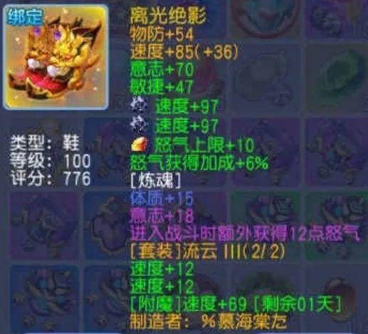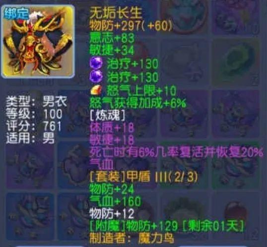炼魂属性:体质加18,敏捷加18,属性稍显不足。特效为6%的神佑,整体来看,炼魂还有较大的提升空间。