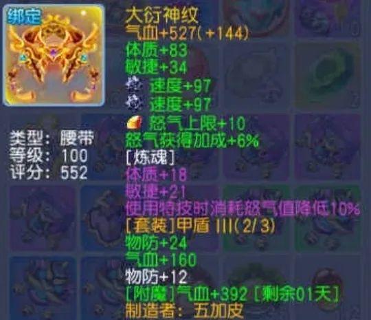附加属性:气血加成527,正好是100级装备的极限属性,不得不说,这条腰带表现得非常出色。