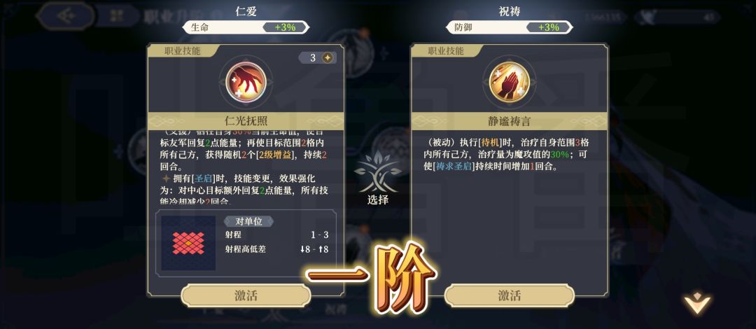 【一阶技能】左边是范围随机加BUFF,选中目标回能。如果有【圣启】可以对选中目标额外回能+减CD