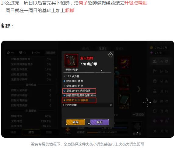 貂蝉核心要求:全身堆火伤即可达到220火伤,多余可以洗的小词条可以选择体力或者电伤