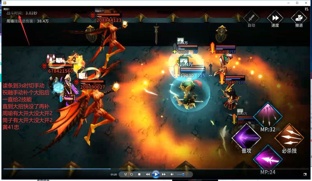 - 由于我们周瑜自动只设置开3技能,祝融只开2技能,到自动到差不多3S龙母减伤BUFF消失的时候取消自动,祝融手动补个大招,周瑜就有大招开大,没大开2技能给怪上融化