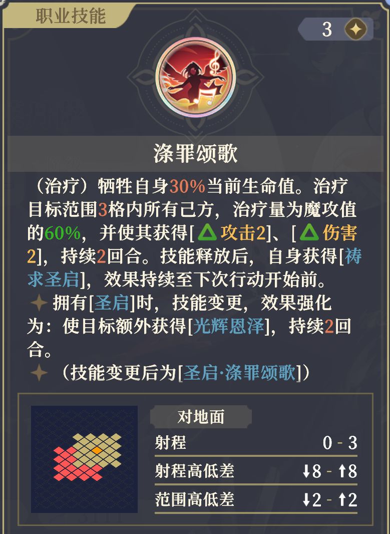★基础效果:准备1回合,使自身范围5格内所有己方,驱散所有[减益],再回复100%生命值,并获得所有[2级增益],持续2回合。准备时立刻释放1次本技能效果,但治疗量与[增益]持续时间减少一半;并获得[祷求圣启],效果持续至下次行动开始。