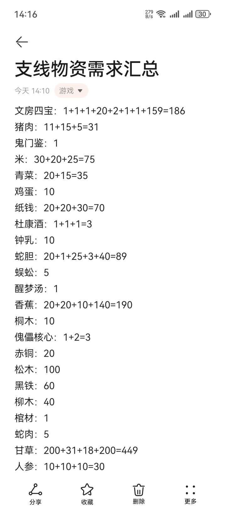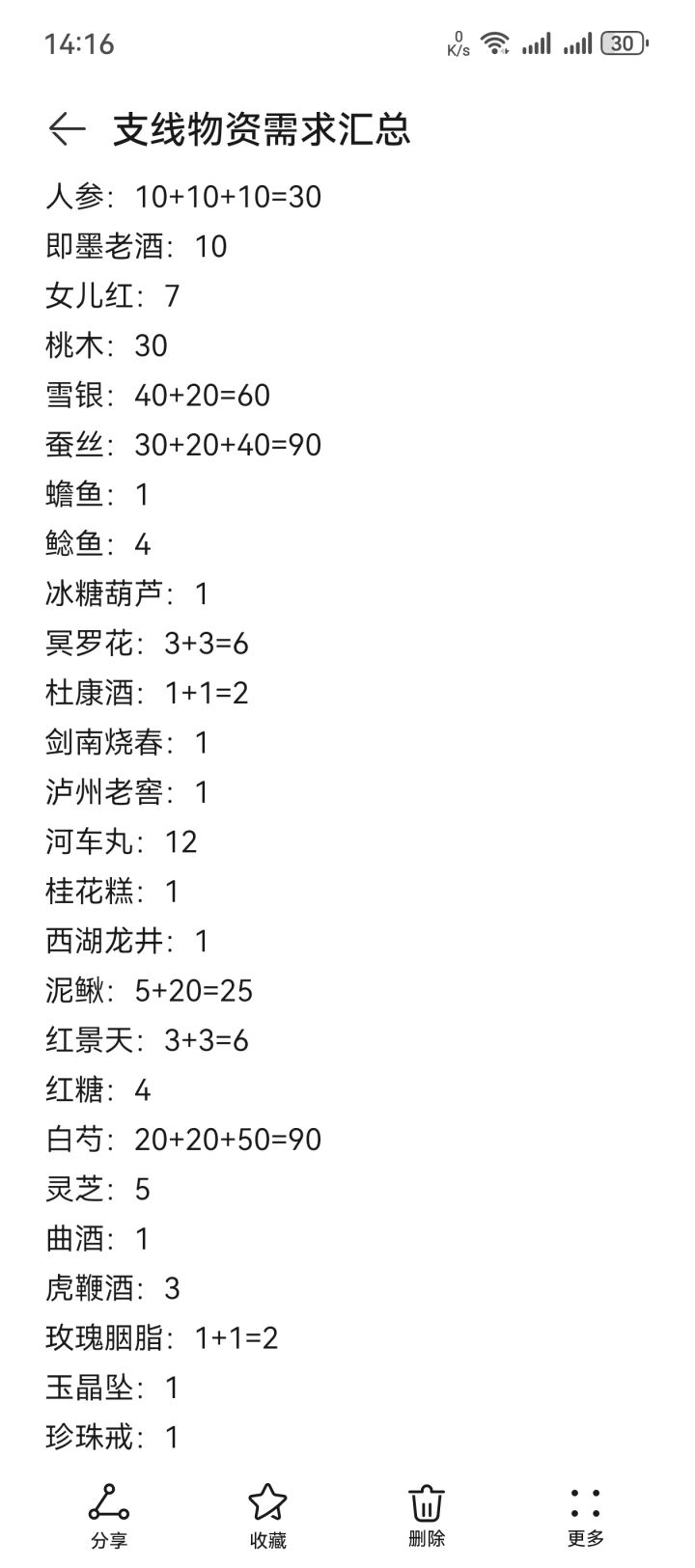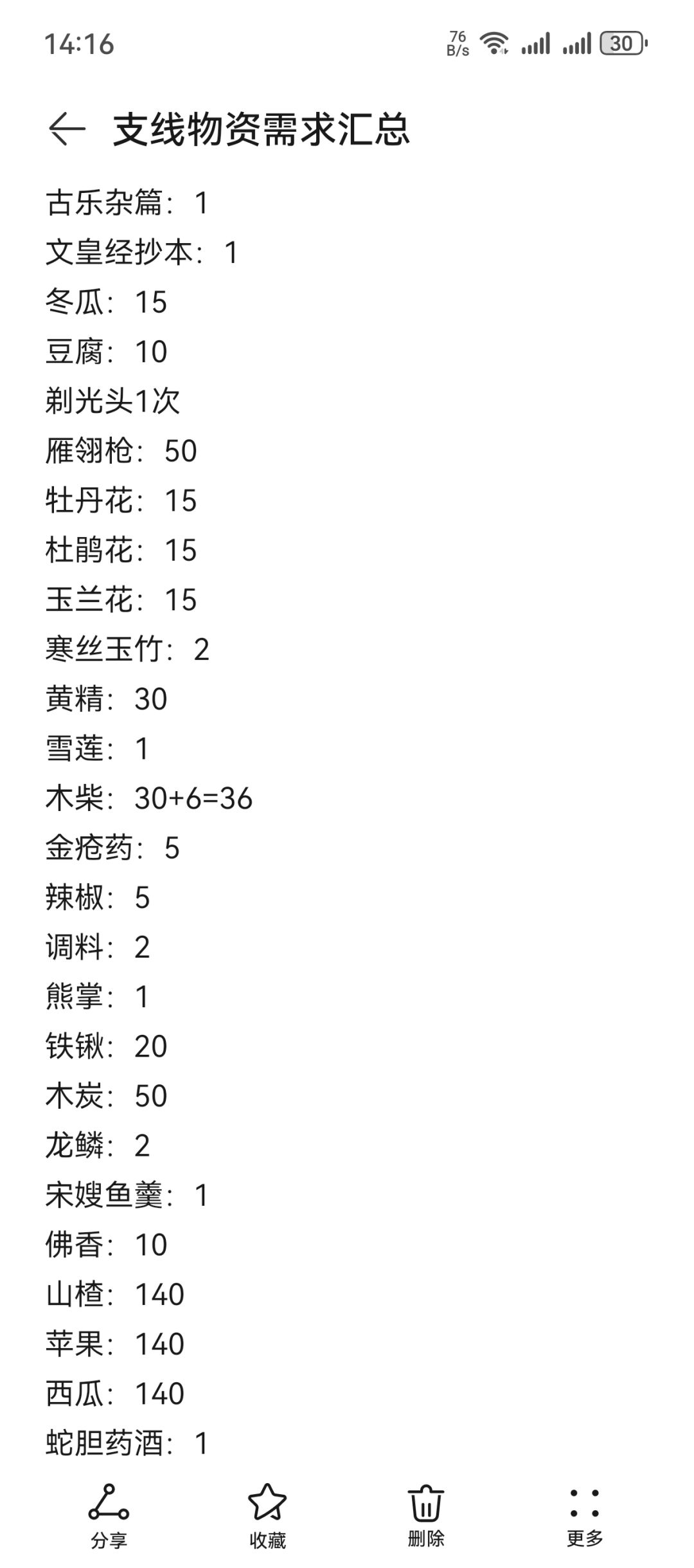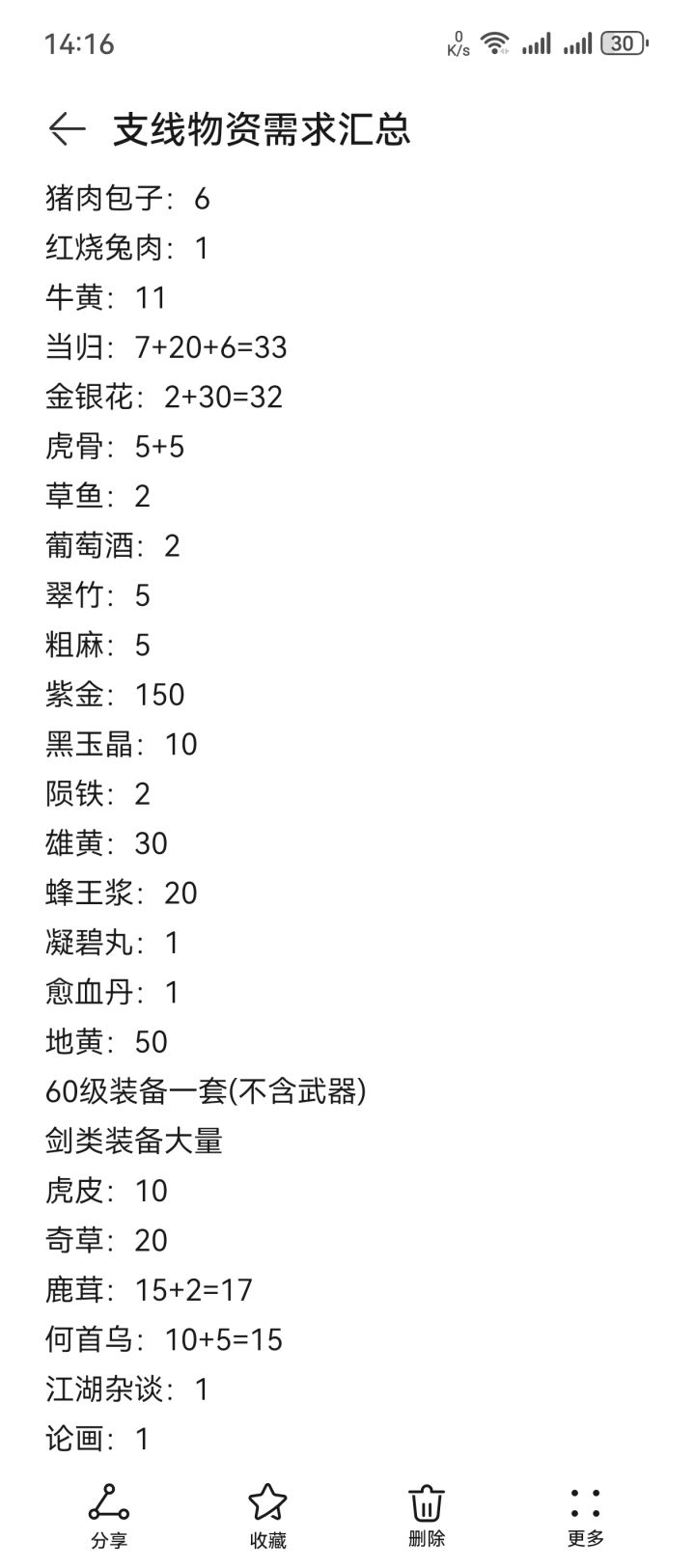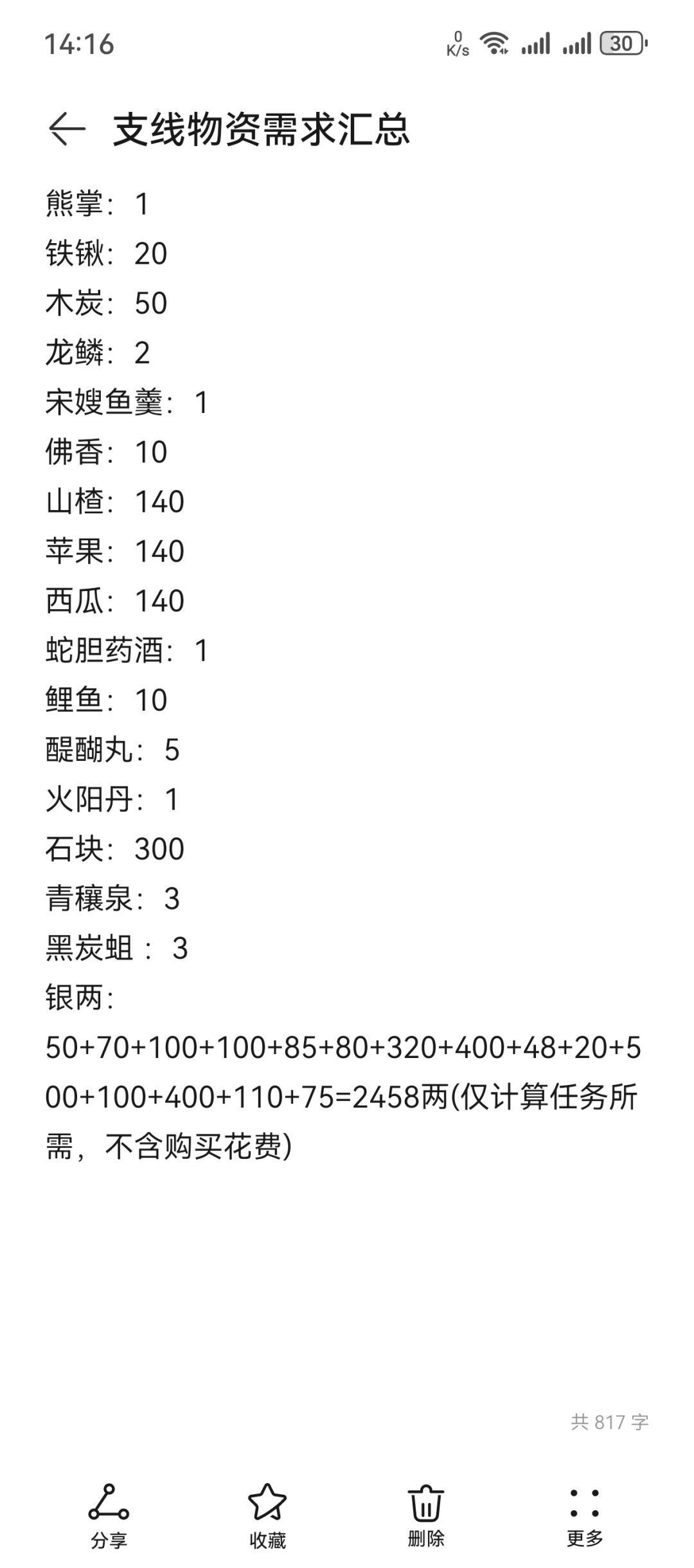 记录支线所需材料,数据摘自烟雨江湖wiki